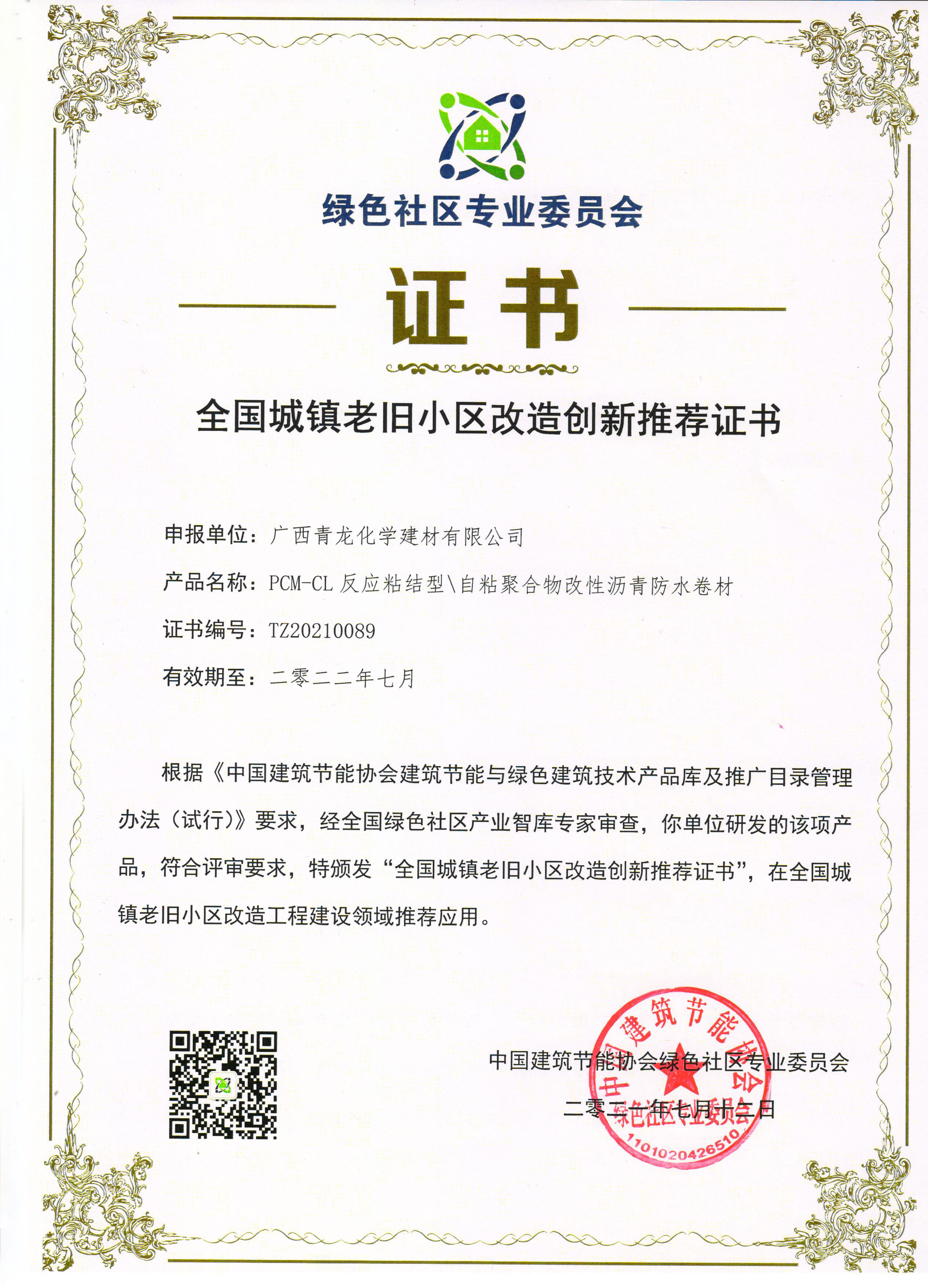 全國(guó)城鎮(zhèn)老舊小區(qū)改造創(chuàng)新推薦證書(shū)