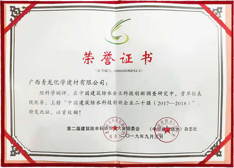 中國建筑防水科技創(chuàng)新企業(yè)二十強(2019-2020)