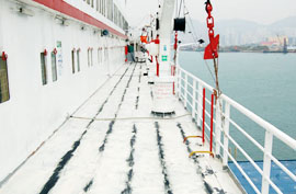 接到該訂單后,公司派一支素質(zhì)過硬的施工隊伍奔赴香港開始作業(yè),由于期間香港天氣變化反復,時常下雨;待基面底漆頑固,銹跡斑斑難以清理,均為凹凸不平的麻面;再加上該郵輪白天需正常營業(yè),施工多只能在晚上進行,等等一系列因素都給施工帶來了嚴峻考驗。青龍公司歷來重視每一筆訂,注重每一個細節(jié),董事長宋敦清先生得知后,親自前往,與公司總工徐新生論證了一個最佳方案后開始指導施工,考慮到施工部位特殊,長期在海面上風吹日曬,最后選用了其耐候、耐酸堿、耐紫外線、耐老化、耐霉菌、耐鹽霧、耐臭氧、耐溶劑、耐磨、耐沖擊和耐油性等綜合性能優(yōu)異的CQ101防水密封涂料。先用特殊纖維填充10mm高度,再在上面找平3mm厚,然后用青龍CQ101防水密封涂料自流平成膜。經(jīng)過一個星期的艱苦奮戰(zhàn),順利完成施工。