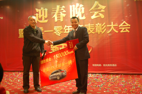 練祖耀(圖右),男,27歲,2009年9月加入青龍營銷團(tuán)隊,經(jīng)過自己勤奮學(xué)習(xí),積極進(jìn)取,2010年個人業(yè)績榮膺榜首,獲青龍"優(yōu)秀業(yè)務(wù)員"稱號,年終青龍董事長宋敦清先生(圖左)獎其現(xiàn)金15萬和價值10萬元小車一輛。