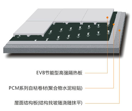 屋面防水保溫隔熱一體化系統(tǒng)的結(jié)構(gòu)層次為結(jié)構(gòu)層——青龍PCM系列自粘防水卷材——EVB節(jié)能型高強(qiáng)隔熱板(如下圖),大大減少傳統(tǒng)防水保溫屋面構(gòu)造層次,減輕了屋面載荷,而且施工十分簡單,屋面防水維修非常方便,綜合性價(jià)比高,完全滿足屋面熱工指標(biāo)計(jì)算要求,防水、隔熱效果顯著,防火等級(jí)為A級(jí)。