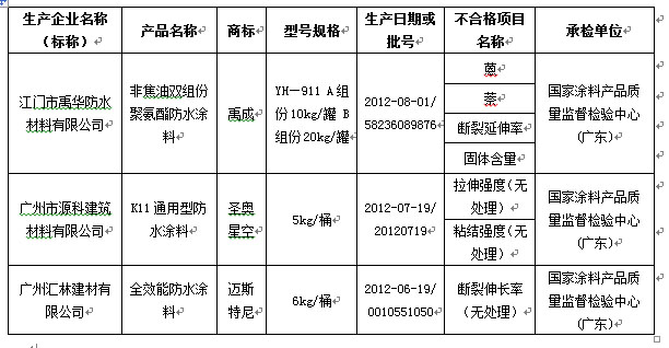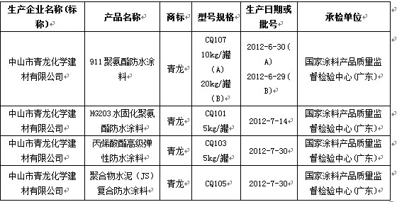 近日,廣東省質(zhì)量技術(shù)監(jiān)督局對廣州深圳、東莞、中山、江門、順德等6個(gè)地區(qū)22家企業(yè)生產(chǎn)的防水涂料產(chǎn)品共32批次進(jìn)行抽查,合格率為90.6%。其中共抽查了青龍公司生產(chǎn)的4批次產(chǎn)品,全部合格。