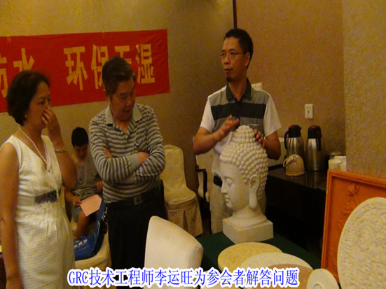 廣西青龍GRC技術(shù)工程師李運旺為參會者重點介紹GRC歐式構(gòu)件生產(chǎn)、技術(shù)、前景、使用范圍等內(nèi)容,通過現(xiàn)場做產(chǎn)品介紹和圖片展示讓更多的設(shè)計師對產(chǎn)品特點及應(yīng)用有了進一步的了解。設(shè)計師們認真聽取產(chǎn)品介紹,并積極發(fā)表自己的看法,現(xiàn)場氣氛活躍。