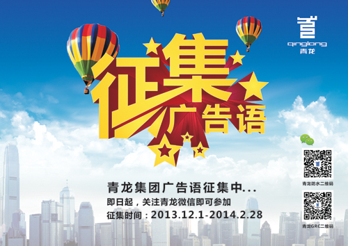 現(xiàn)為了使各地代理商、消費者及社會公眾更加容易理解青龍集團(tuán)的環(huán)保節(jié)能、社會責(zé)任、誠實守信等文化涵義,建立青龍集團(tuán)全新品牌形象,現(xiàn)向社會各界征集集團(tuán)廣告語。歡迎社會各界踴躍參與。