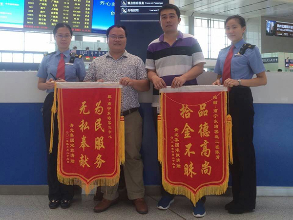 據(jù)悉,青龍公司宋先生在一次出差途經(jīng)過南寧東站時,由于行程匆忙,在候車室將一個重要行李箱遺失。原本以為車站人員混雜,行李箱很難找回,沒想到被正在值班的二班員工陳芳女士細心發(fā)現(xiàn)并通過廣播尋找到宋先生。行李箱的失而復得,讓宋先生非常驚喜。為感謝動南寧東站客運中心,感謝陳芳女士細心和責任,更為了宣揚難能可貴的質(zhì)拾金不昧的正能量,出差在外的宋先生特別囑咐同事一定要好好感謝南寧東站客運中心及陳芳女士。