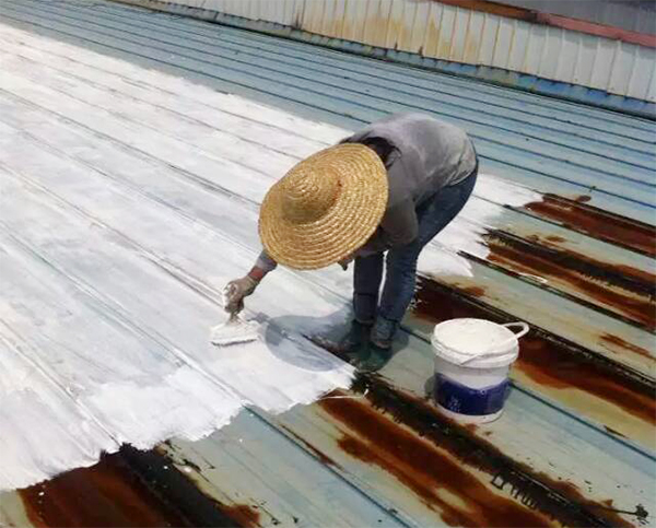 青龍公司中山經(jīng)銷商張總成功承接了這一防水補漏工程。經(jīng)過實地仔細檢查,并經(jīng)與客戶詳細協(xié)商,之后敲定采用青龍公司CQ103丙烯酸酯好的彈性防水涂料和CQ104單組份濕固化純聚氨酯防水涂料的組合補漏方案。青龍CQ103丙烯酸酯防水涂料具有良好的耐老化、延伸性、粘結(jié)性、成膜性及耐高溫性,因此非常適合在鐵皮房屋頂作整體涂刷;而屋頂排水溝則采用CQ104單組份濕固化純聚氨酯防水涂料。