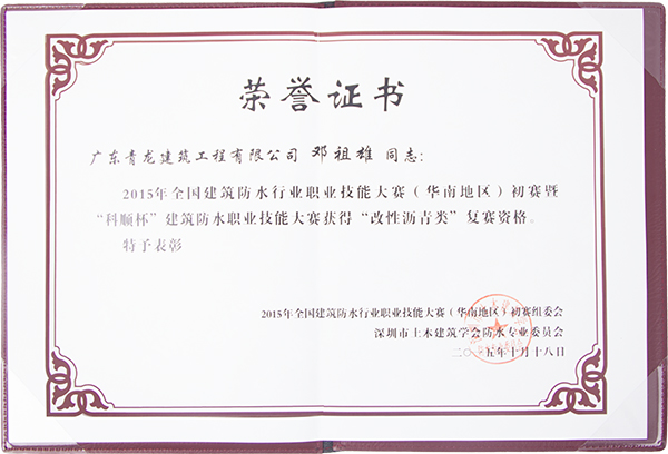 10月17日至18日,由中國建筑防水協(xié)會主辦、深圳市土木建筑學(xué)會防水專業(yè)委員會承辦的建筑防水職業(yè)技能大賽暨2015全國建筑防水行業(yè)職業(yè)技能大賽(華南地區(qū))在廣東高明舉行。來自全國的12家防水企業(yè)32位選手參加了比賽,青龍公司員工鄧祖雄先生憑借在改性瀝青和高分子防水卷材上的過硬表現(xiàn),順利晉級。