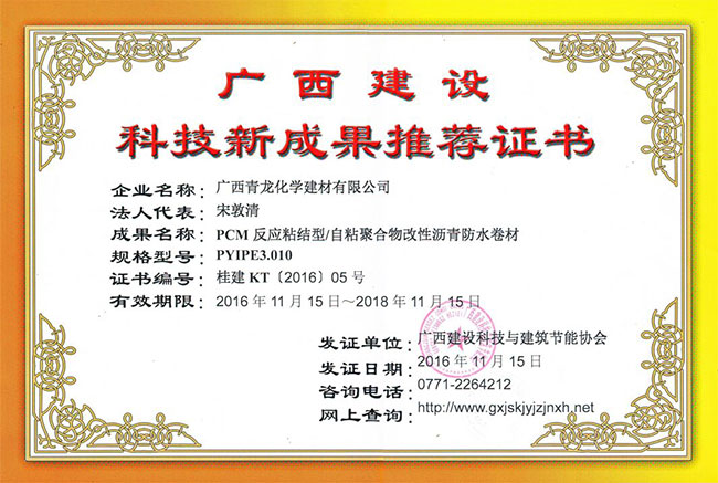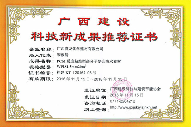 青龍PCM防水卷材已經(jīng)成功應(yīng)用在全國500個大小防水工程上,防水效果顯著。此次獲得廣西科技新成果推薦證書,表明了我司防水卷材在質(zhì)量性能和各項指標(biāo)方面均符合國家規(guī)定的質(zhì)量標(biāo)準(zhǔn),質(zhì)量值得信賴。今后,我司也將不斷提高產(chǎn)品質(zhì)量,加大提升防水卷材科技含量和開拓深化防水市場的步伐,在防水市場上大力推廣青龍的品牌。