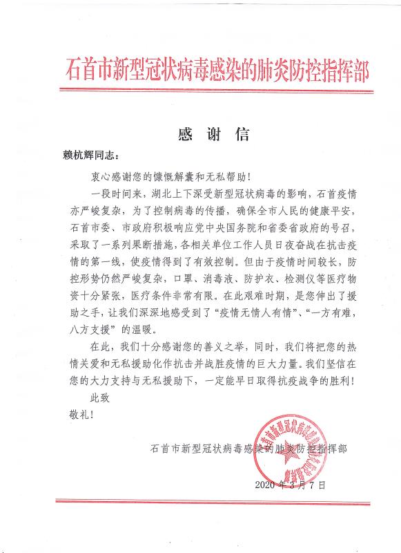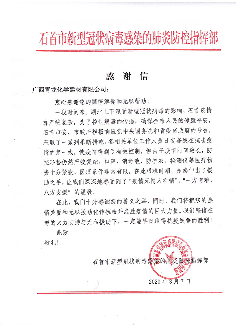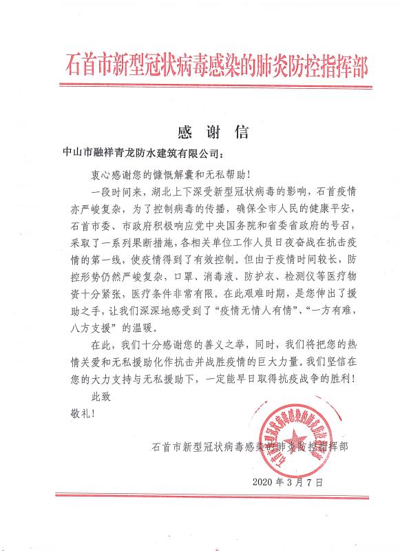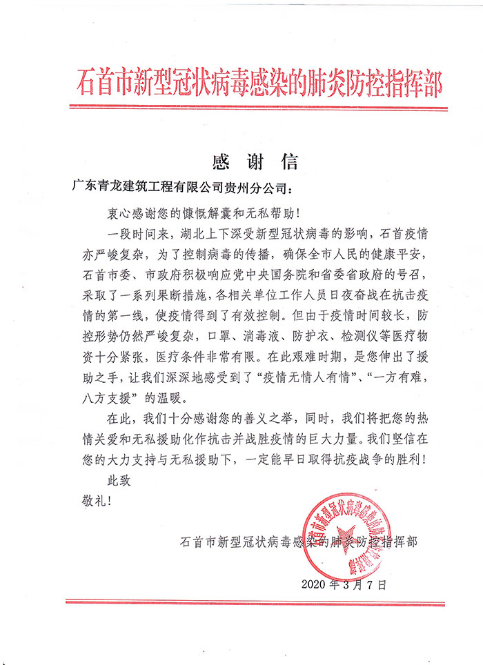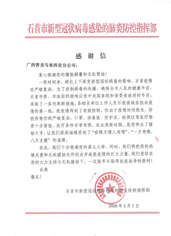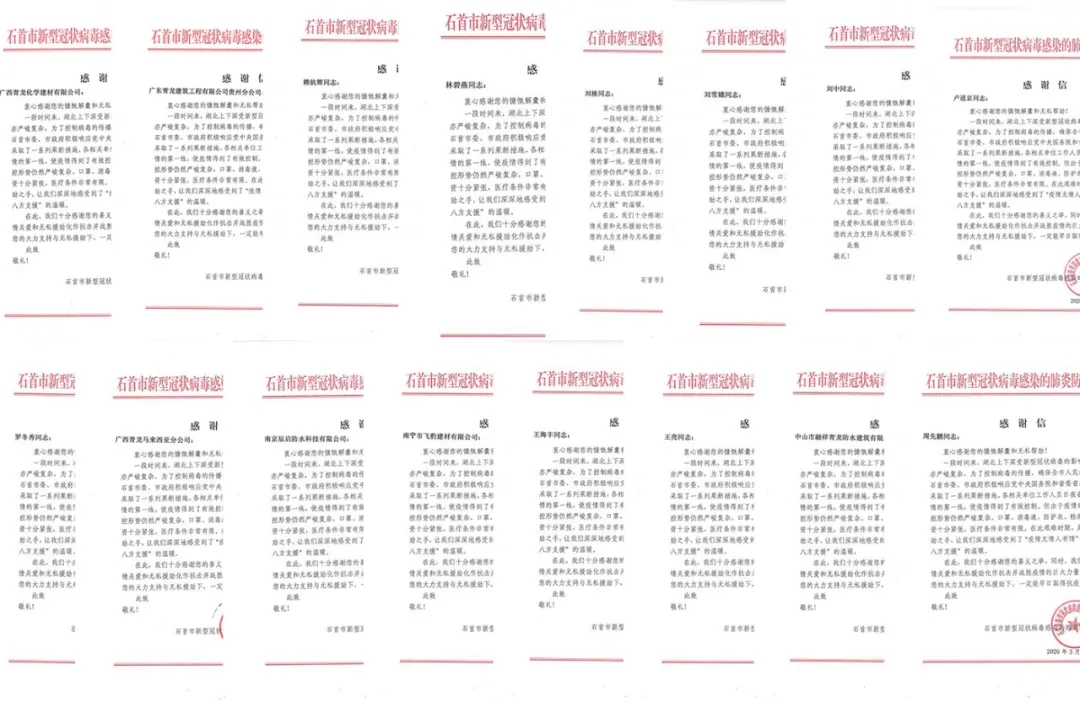 當全國疫情數據持續(xù)向好,各地復工復產有序進行的時候。青龍公司收到了來自湖北省石首市新型冠狀病毒感染的肺炎防控指揮部16封特殊的感謝信。