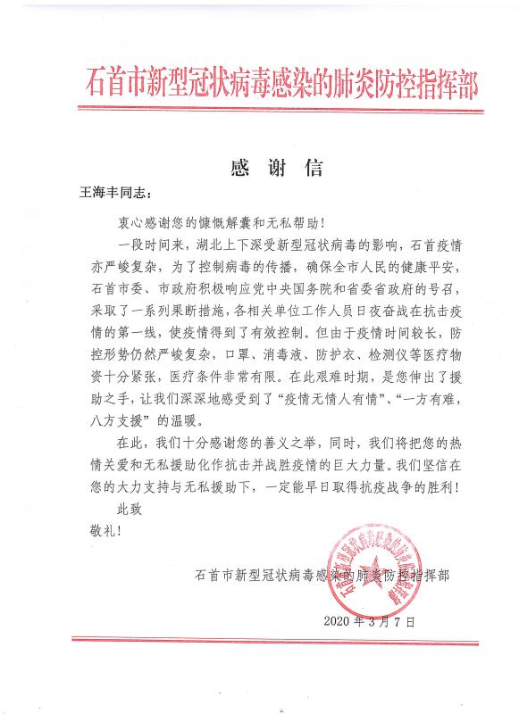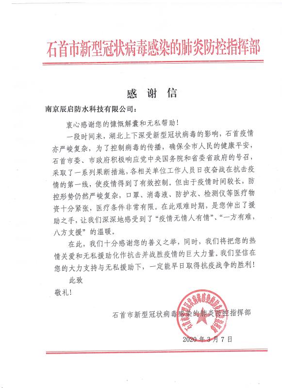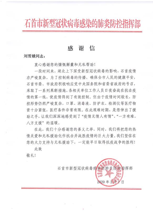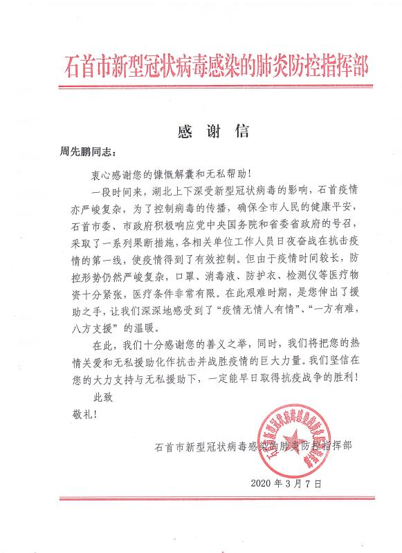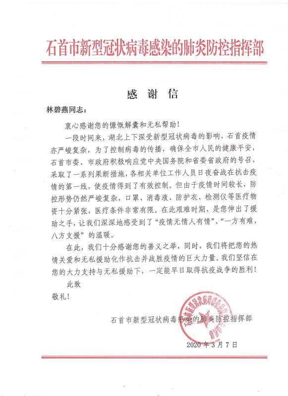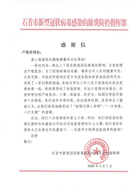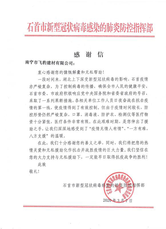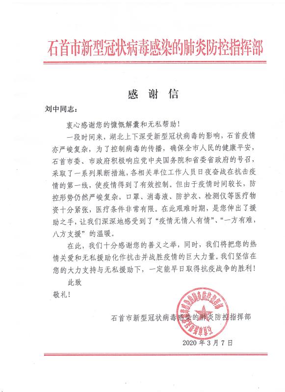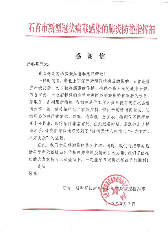 當全國疫情數據持續(xù)向好,各地復工復產有序進行的時候。青龍公司收到了來自湖北省石首市新型冠狀病毒感染的肺炎防控指揮部16封特殊的感謝信。