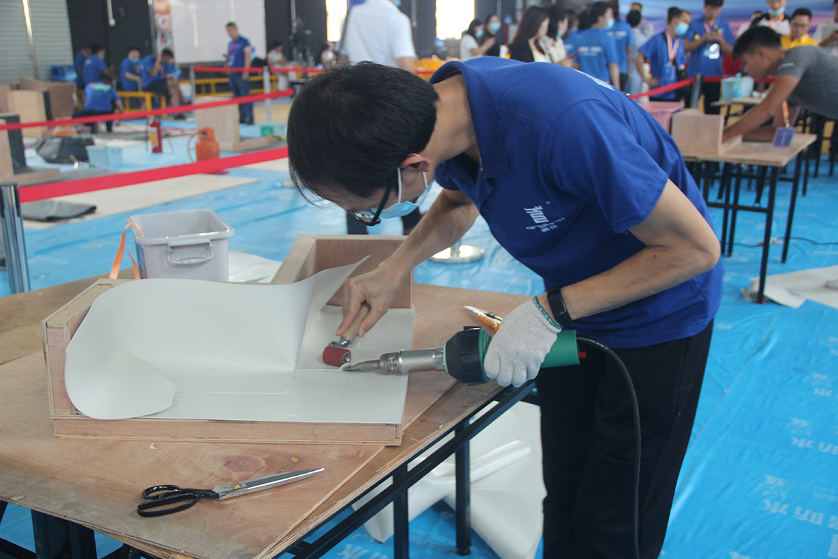 那么這邊是PVC高分子自粘膠膜,它也主要是考驗選手的搭接,搭接不牢的話,卷材就會容易竄水。高分子類,不管是PVC、HTPE、還是TPO,它們都是同樣的施工方法。我們現(xiàn)場比賽選用的是青龍的PVC防水卷材,它的搭接原理是熱風(fēng)焊接。熱風(fēng)焊接可分單焊線和雙焊線,選手比賽也是模擬屋面項目,先是裁線、剪切,然后是搭接,搭接縫也不能低于6公分。因為高分子材料的張力比較強(qiáng),它沒有改性瀝青材料那樣服貼,它的難度相對于SBS要稍高的。
