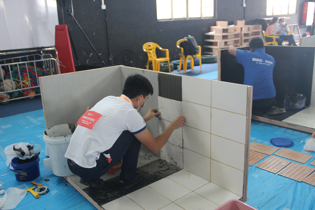 前面有一組是做衛(wèi)生間貼磚。傳統(tǒng)的認(rèn)知,大家都以為防水技能工一定是農(nóng)民工,在社會地位得不到尊重。但是在這次的比賽場,有一個有趣的現(xiàn)象,選手越來越年輕化,你看還有很多是小鮮肉、小帥哥。所以說防水技能工不是沒有技術(shù)含量的普通的農(nóng)民工,而是有技術(shù)含量,可以受到社會認(rèn)可的。包括今天的這次比賽,也是全國人社廳認(rèn)可的,如果成績優(yōu)異的選手,都會獲頒發(fā)證書的。所以說,我們的選手越來越年輕化,不用擔(dān)心青黃不接的問題。