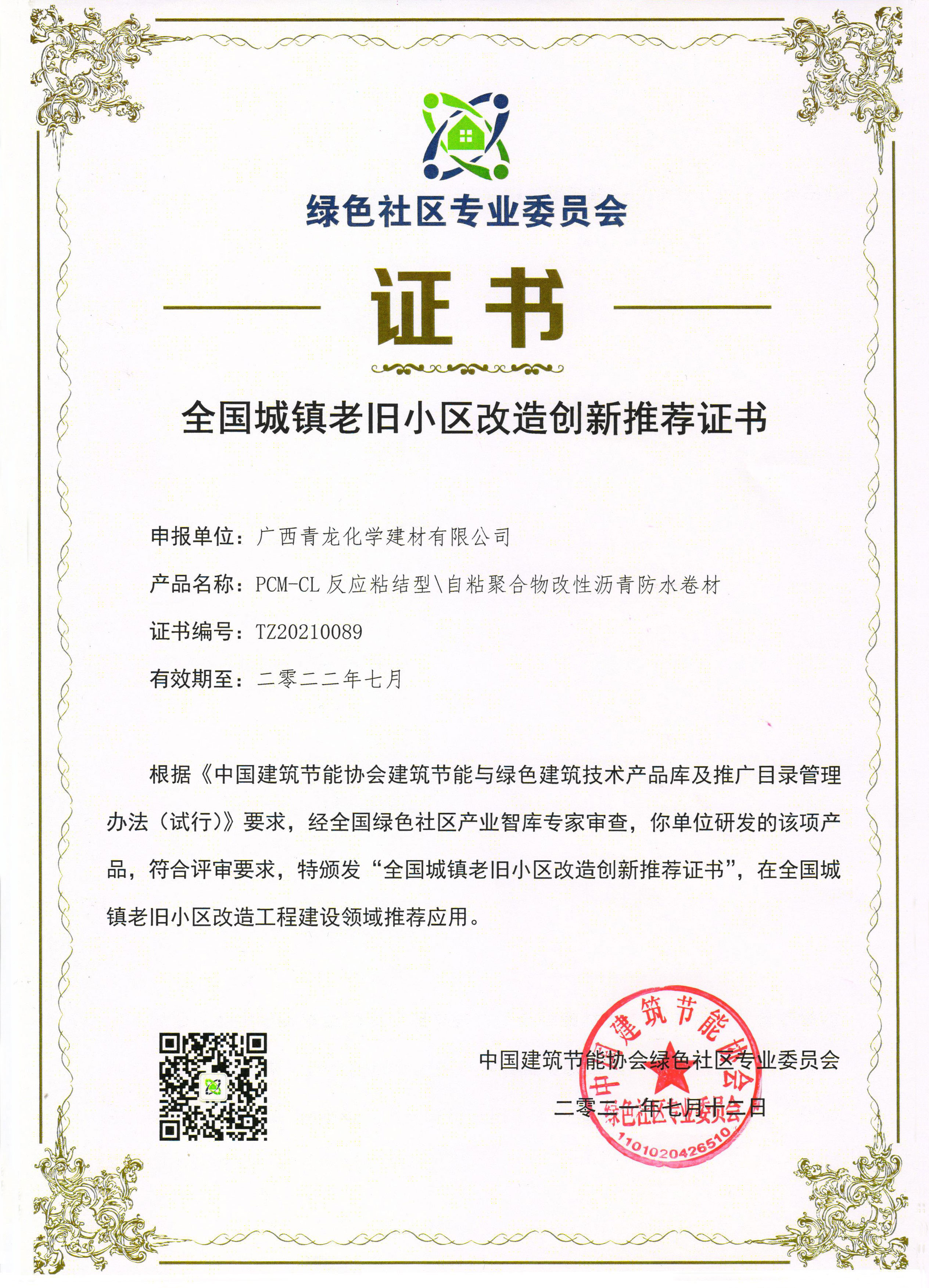 近日,由中國建筑節(jié)能協(xié)會綠色社區(qū)專業(yè)委員會主辦,全國城鎮(zhèn)老舊小區(qū)改造創(chuàng)新推薦產(chǎn)品、技術申報企業(yè)材料評審會圓滿結束,在公開、公平、公正的原則下,青龍公司自主研發(fā)生產(chǎn)的PCM-CL反應粘結型自粘聚合物改性瀝青防水卷材成功入選全國城鎮(zhèn)老舊小區(qū)改造創(chuàng)新產(chǎn)品推薦名單。