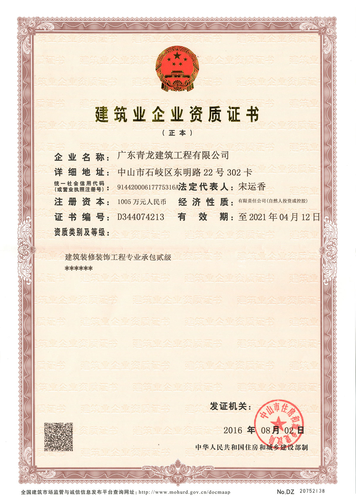 建筑裝修裝飾工程專業(yè)承包資質(zhì)對企業(yè)資產(chǎn)、企業(yè)主要人員、企業(yè)工程業(yè)績都有著非常高的要求,建筑裝修裝飾工程專業(yè)承包貳級資質(zhì)的成功取得,是對青龍實力的認可,對于進一步擴大企業(yè)的品牌影響力、提升企業(yè)競爭力有著重大意義。