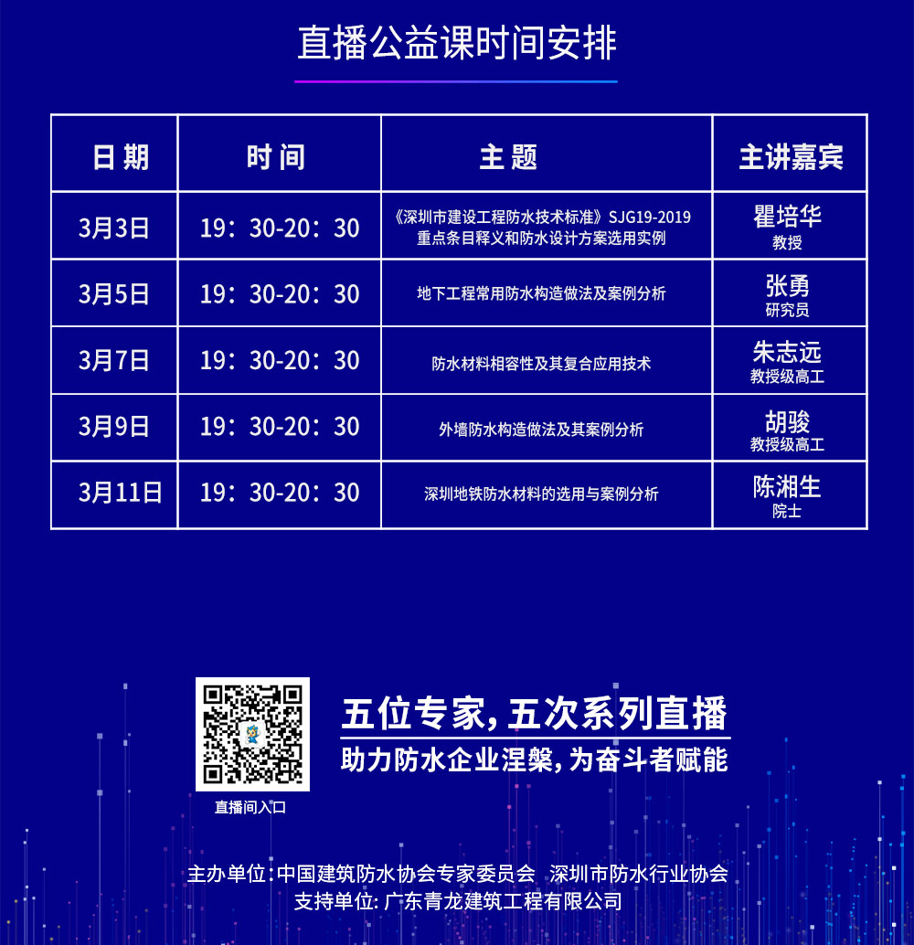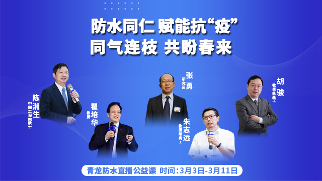 本次防水公益直播是為貫徹落實黨中央關于新冠肺炎疫情防控工作的決策部署,積極響應各級政府的號召,由中國建筑防水協(xié)會專家委員會、深圳市防水行業(yè)協(xié)會主辦,廣東青龍建筑工程有限公司協(xié)辦,直播由陳湘生院士領銜,瞿培華教授、張勇博士、朱志遠教授和胡駿教授4位專家支招,助力防水企業(yè)涅槃,為奮斗者賦能,讓我們防水人同氣連枝,共盼春來。