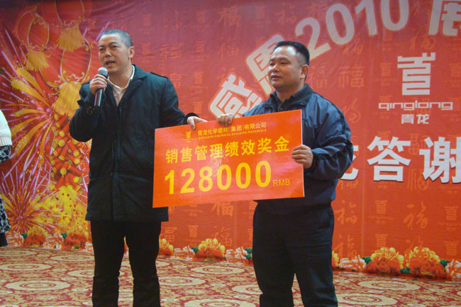 會(huì)上,青龍公司重點(diǎn)表彰了優(yōu)秀代理商代表和企業(yè)優(yōu)秀員工,其中對(duì)廣西青龍公司曾知博經(jīng)理個(gè)人銷售管理績(jī)效獎(jiǎng)金高達(dá)12.8萬(wàn)元,曾總發(fā)表感言說(shuō),青龍公司是個(gè)一個(gè)重信譽(yù),講誠(chéng)信,有實(shí)力的企業(yè),非常感謝青龍能給自己這樣一個(gè)實(shí)現(xiàn)自我價(jià)值的平臺(tái),并表示愿意和廣西青龍廣大同仁一起努力拼搏,2011年再創(chuàng)輝煌。