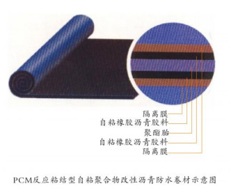 PCM反粘結(jié)型自粘聚合物改性瀝青防水卷材有兩種類型,一種是由合成橡膠和樹脂改性瀝青中加入特殊改性劑,聚酯胎為胎體,聚乙烯膜為表面材料或無膜(雙面自粘),采用硅油防粘隔離膜制成的;另一種是由PET聚酯膜(鍍鋁、鋁塑復合)、自粘橡膠瀝青料、硅油防粘隔離膜組成。