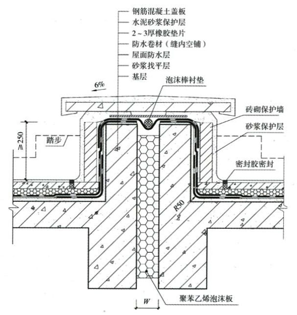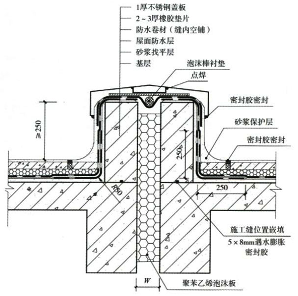 《屋面工程技術(shù)規(guī)范》 GB 50345-2012 4.11.18變形縫的防水構(gòu)造應(yīng)符合下列規(guī)定: 1.變形縫泛水處的防水層應(yīng)增設(shè)附加層,附加層在平面和立面的寬度不應(yīng)小于250mm;防水層應(yīng)鋪貼或刷至泛水墻的頂部。 2.變形縫內(nèi)應(yīng)預(yù)填保溫材料,上部應(yīng)采用防水卷材封蓋,并放置襯墊材料,再在其上干鋪一層卷材。 《屋面工程質(zhì)量驗收規(guī)范》 GB 50207-2012 8.6.5 等高變形縫頂部宜加扣混凝土或金屬蓋板?;炷辽w板的接縫應(yīng)用密封材料封嚴;金屬蓋板應(yīng)鋪釘牢固,搭接縫應(yīng)順流水方向,并應(yīng)做好防銹處理。 8.6.6 高低跨變形縫在高跨墻面上的防水卷材封蓋和金屬蓋板,應(yīng)用金屬壓條釘壓固定,并應(yīng)用密封材料封嚴 |