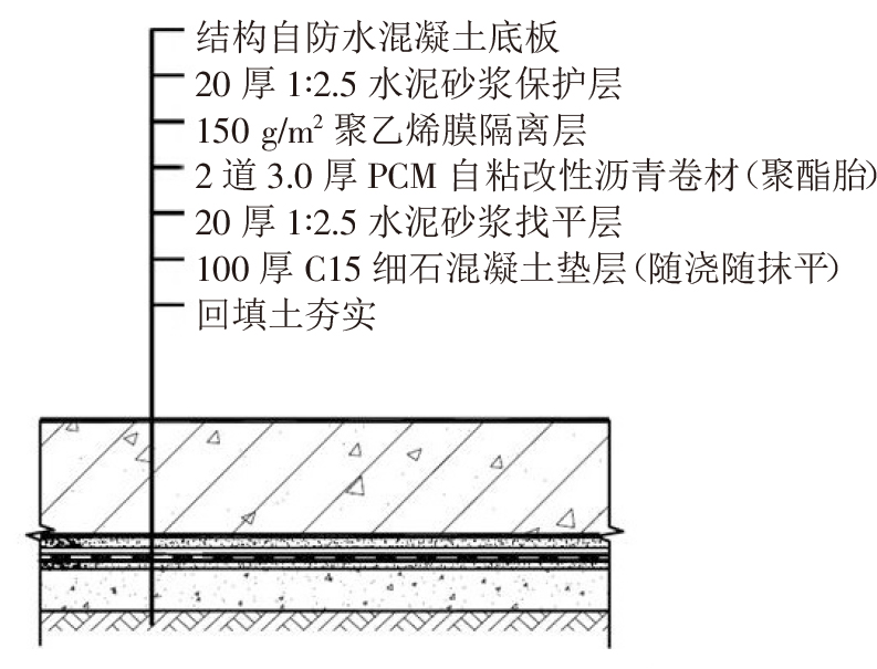 防水卷材選用本公司生產的3.0mm厚PCM自粘聚合物改性瀝青防水卷材(PY類)。該卷材是通過在樹脂和合成橡膠改性瀝青中加入少量活性成分,以聚酯胎作為胎體,以PE膜為表面材料,結合硅油隔離膜制備而成的防水卷材。該卷材具備較強的基層防竄水性能,卷材中的高分子材料可與基層粘接劑中的高分子和無機膠凝材料構成界面互穿網絡,能有效避免防水層出現整體失效的情況。材料可冷施工,無火災隱患,不會污染環(huán)境,可直接在潮濕的基面上進行施工,基層無需做找平層,施工工藝便捷。另外,防水材料有較好的穩(wěn)定性、延伸性、耐腐蝕性和耐候性。