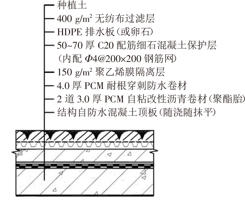隔離層采用0.4mmPE膜,其主要作用為避免防水層與上方的細石混凝土保護層形成粘連,消除機械咬合力。過濾層采用單位面積質量大于200g/m2的聚酯無紡布。種植土和植被層根據設計要求進行施工。