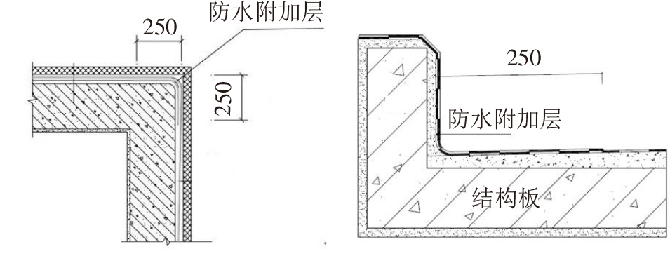 在基面陰陽角兩側做好防水附加層,其總寬度為500mm左右。平立面連接處的陰陽角需抹成圓角形狀,其中陽角半徑大于20mm,陰角半徑大于50mm(圖6)。
