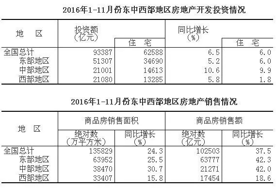 (2)1-11月份,東部地區(qū)房地產(chǎn)開發(fā)投資51307億元,同比增長5.2%,中部地區(qū)投資21001億元,增長10.6%;西部地區(qū)投資21080億元,增長5.8%。